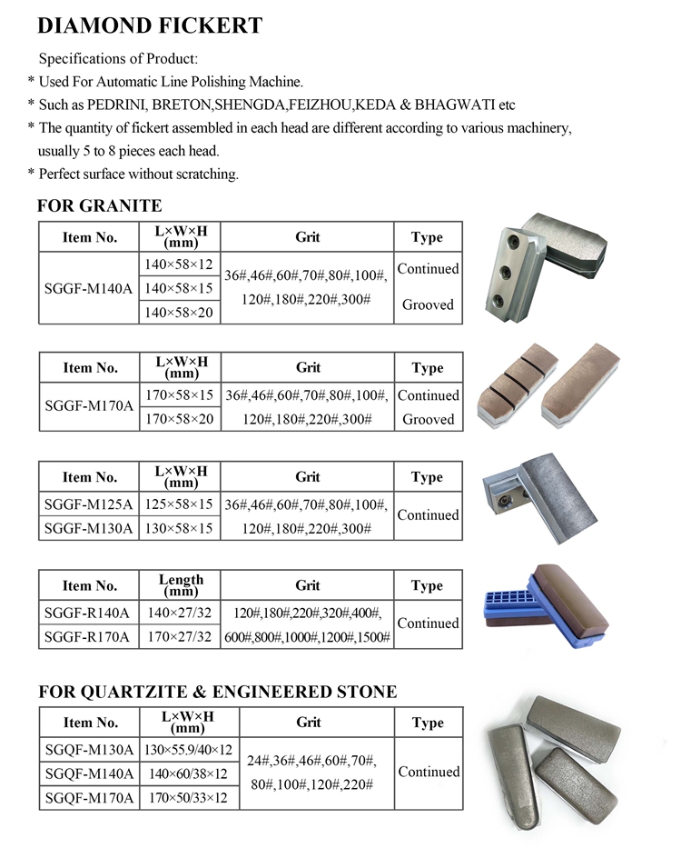 SANG Diamond Tools menawarkan Fickert Berlian Metal Bond 140MM dan 170MM premium yang dirancang khusus untuk penggilingan dan kalibrasi permukaan granit. Dirancang untuk masa pakai yang lama, presisi penggilingan yang tinggi, dan kinerja yang konsisten, fickert kami ideal untuk lini pemolesan otomatis dan mesin manual.